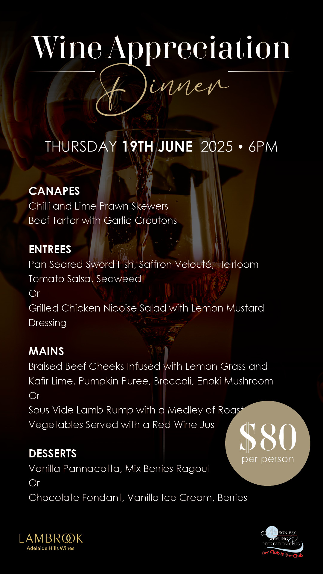 4 course meal perfectly paired with Lambrook wines Guest speaker, Adam Lampit, owner and wine maker $80 per person Limited seats